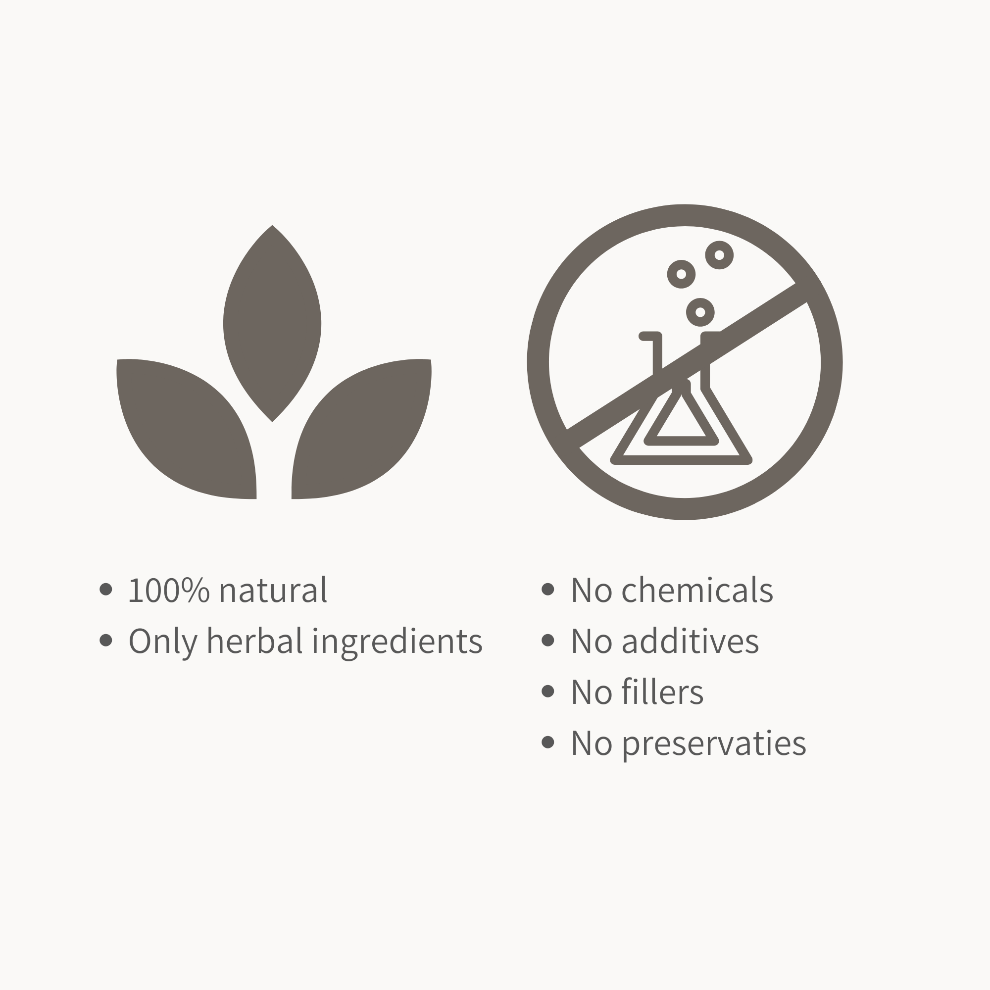 Our formulations proudly contain only herbal ingredients and potato starch, allowing us to achieve true purity in our products. Our highly specialised and unique extraction process allows us to leave out all nasties, chemicals, fillers and preservatives.
