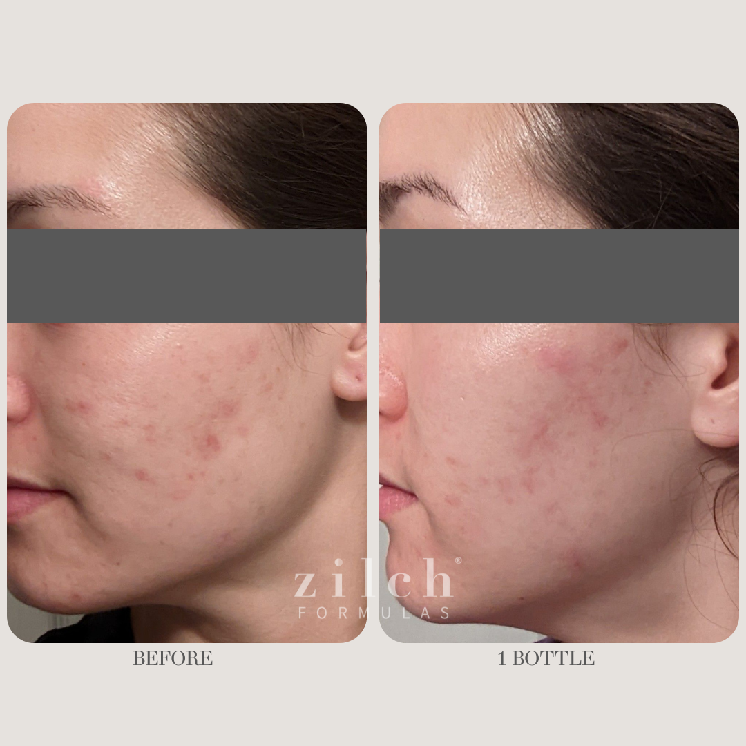 I noticed a big difference to my moderate acne especially on my cheeks when taking 3 pills twice a day. It didn't completely clear my acne but it reduced active breakouts and gave my skin a chance recover and fade hyperpigmentation. Hoping to see more results once I've finished my second bot...tle of Zilch! Thank you for making a natural solution without harmful side effects. Highly recommend!