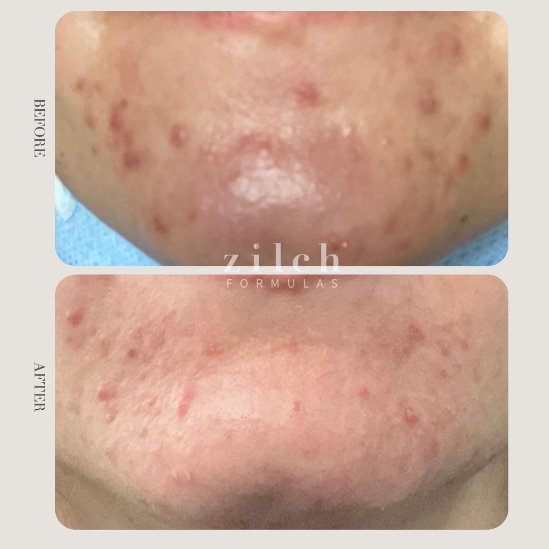 I have tried many topical and oral treatments for my acne, seen multiple derms with no long term results. I decided to come off BC and sprinolactone in hopes to finding a natural solution to my skin and gut health, as everything else felt like bandaids. I have purchased sooooo many zilch bottles ove...r the years, beginning in I believe 2020, it is my go to when my skin begins to break out. I get painful deep breakouts on my chin, zilch has always helped to bring down the inflammation and severity of the breakouts. During this past year of post birth control, I used zilch religiously to help keep my skin calm as my hormones balanced out. I am now one year of no bc pill, my skin is still struggling but I can see improvements! I strongly point to zilch for giving me the confidence to stop taking bandaid approaches to my skins health, I was nervous for the side effects (more acne) but having used zilch I knew it would be a great sidekick as I went on this journey. First three photos really show the deep/painful breakouts over this past year, the last photo shows my current, less inflammation and painful spots.